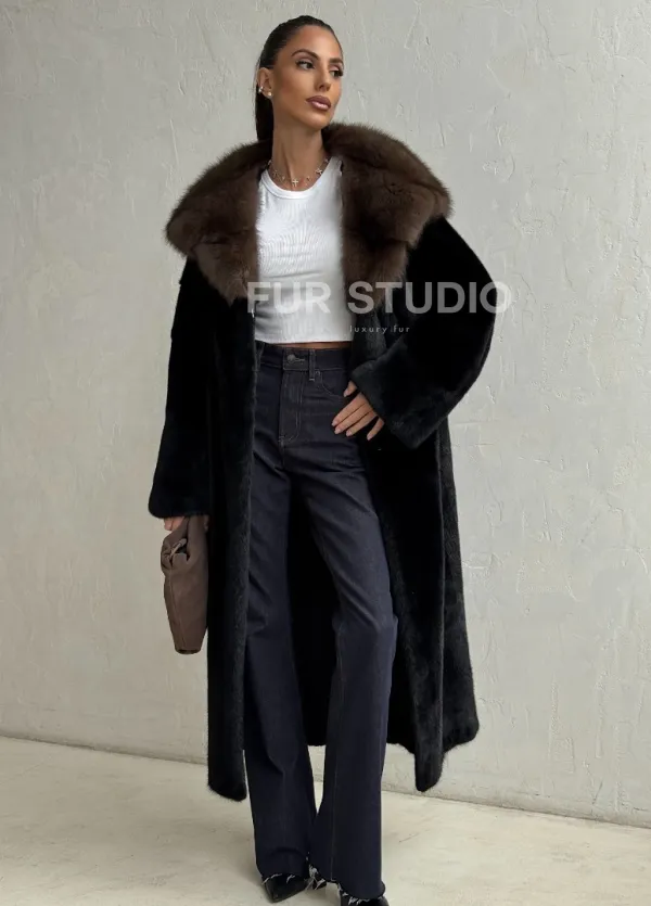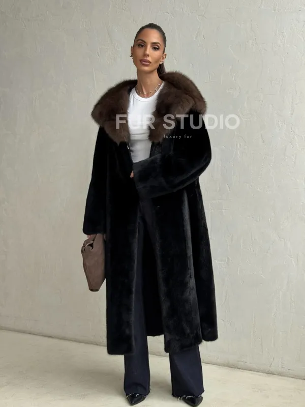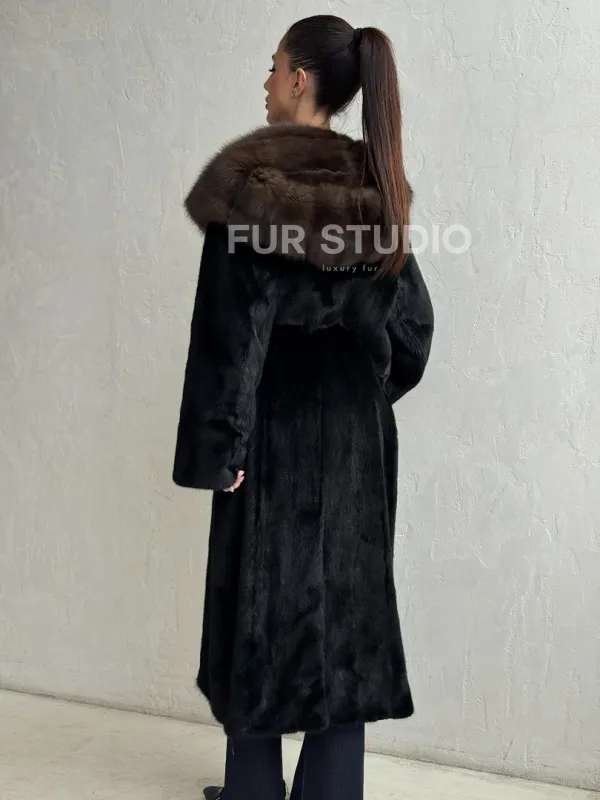 Мех данной шубы аукционная норка, цвет черный. Предлагается в размерах от 42 до 50. Длина модели 115-120 см, что выгодно подчеркивает фигуру девушек. Эта модель идеально подойдет для девушек и женщин, предпочитающих роскошные натуральные меха.