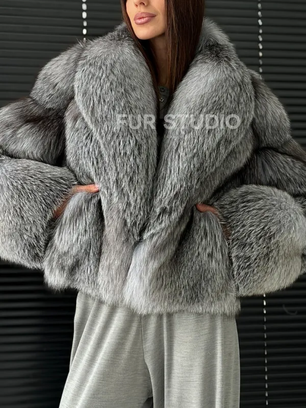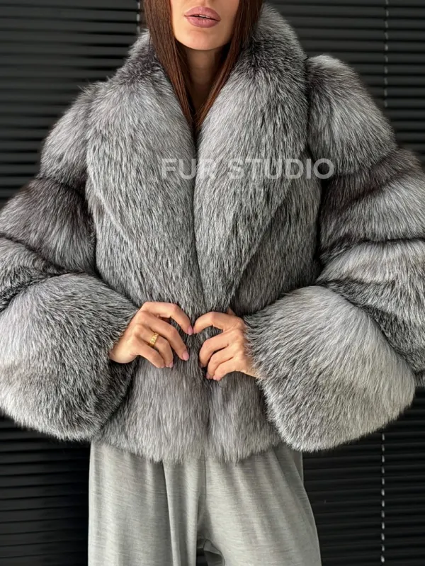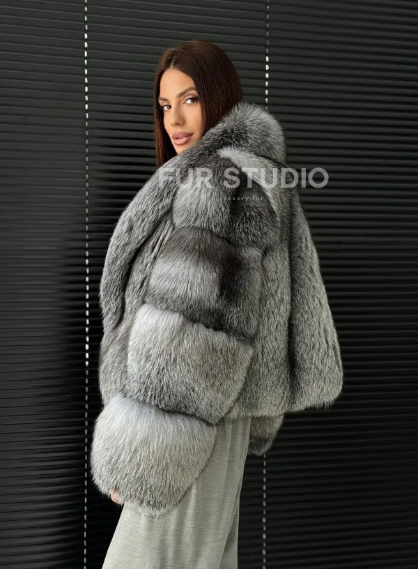 Мех данной шубы лиса, цвет серый. Предлагается в размерах от 42 до 50. Длина модели 50-55 см, что выгодно подчеркивает фигуру девушек. Эта модель идеально подойдет для девушек и женщин, предпочитающих роскошные натуральные меха.