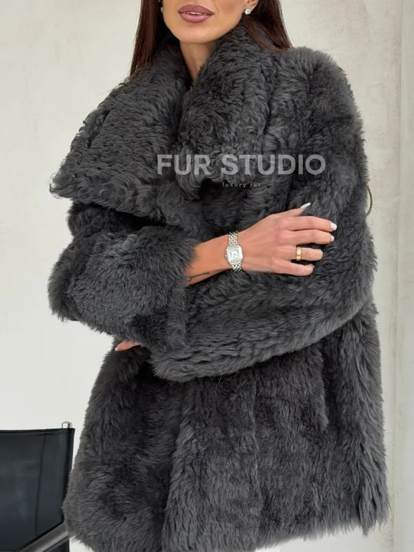 Серая дубленка из тиградо. Модель предлагается в размерах от 42 до 48. Оптимальная длина моделей 70-75 см подчеркивает линии вашей фигуры. Эта дубленка станет неотъемлемой частью гардероба для тех, кто предпочитает роскошь и утонченность натуральной кожи.