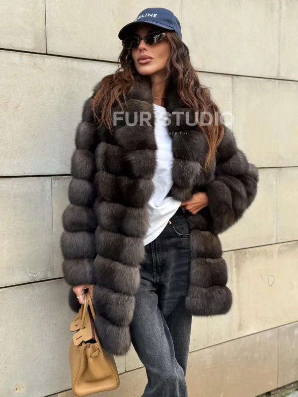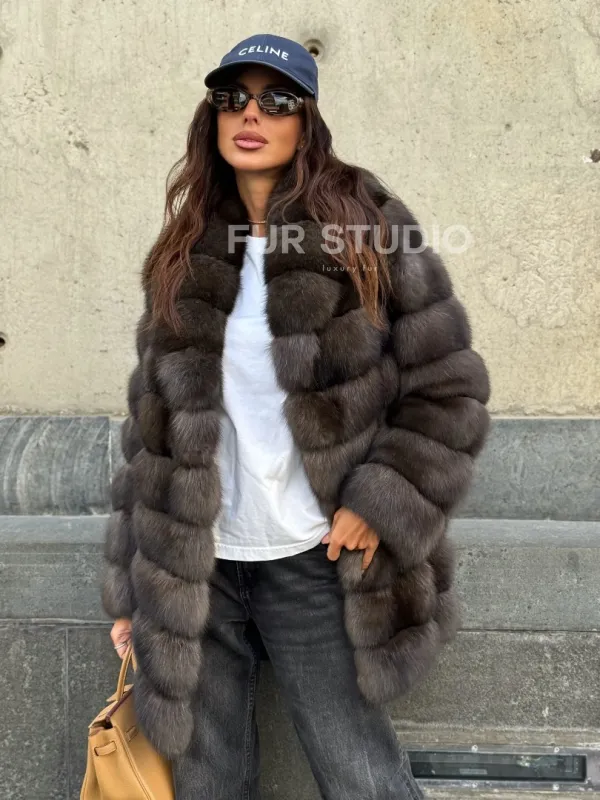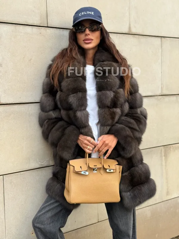 Оптимальная длина удобна в носке, не сковывает движение. Воротник стойка позаботится о шее в непогоду и подчеркнет ее изящество. Широкие рукава выделят тонкие кисти. Прямой крой удлиняет силуэт и зрительно скрывает недостатки фигуры. Купить шубу из меха соболя станет отличным вложением для женщин, которые не привыкли себе в чем-то отказывать.