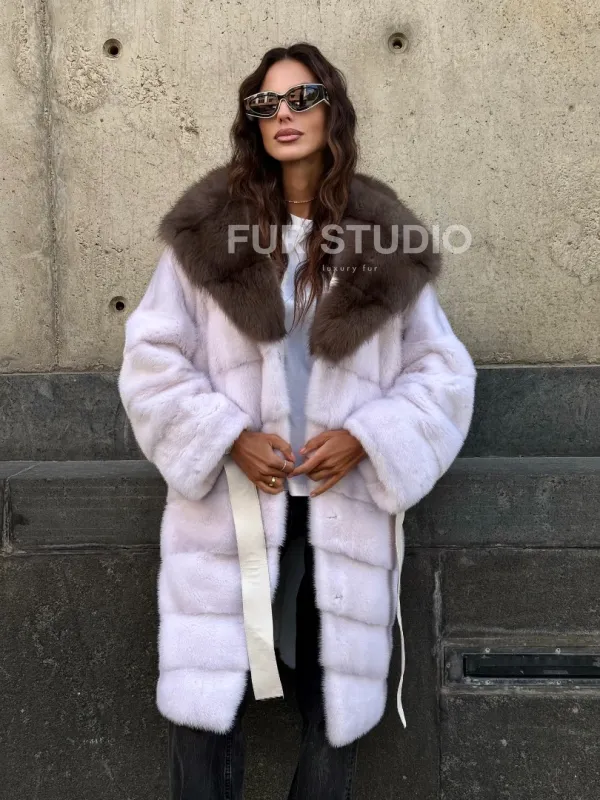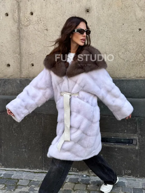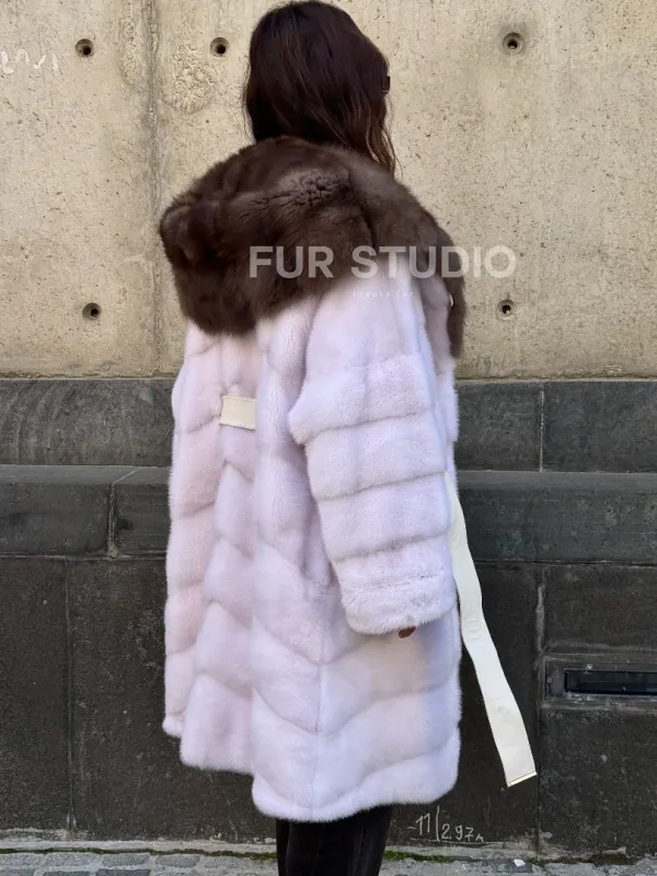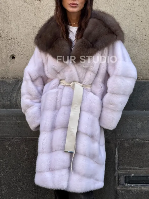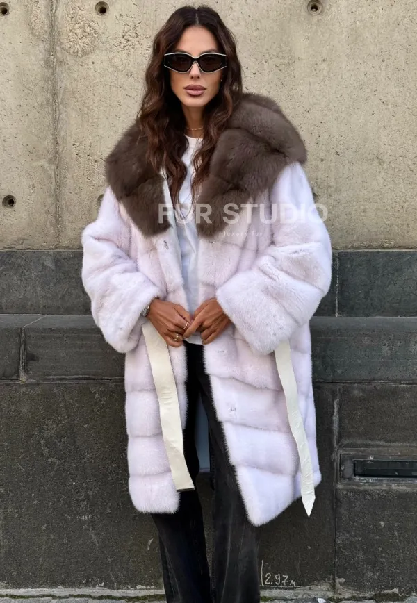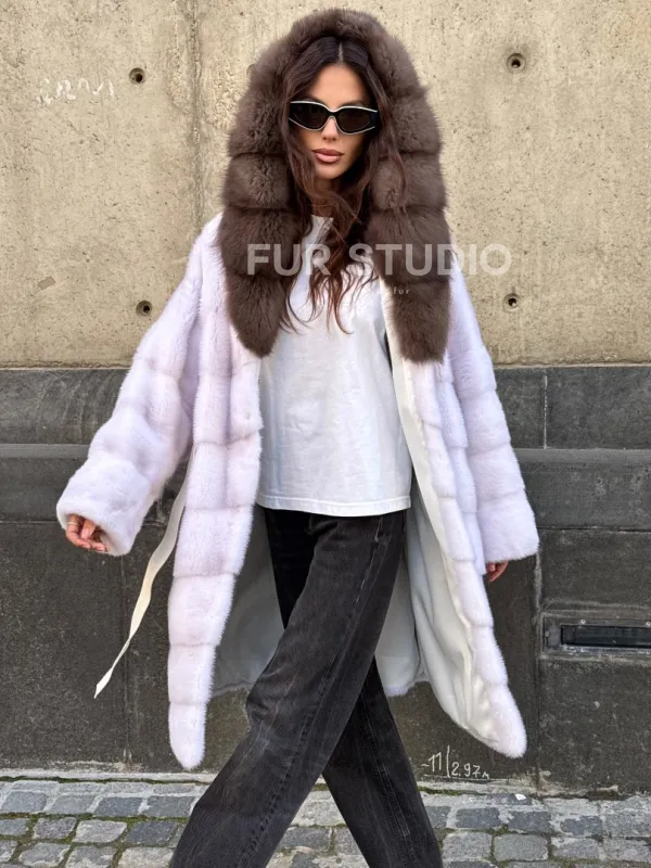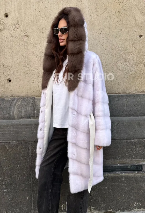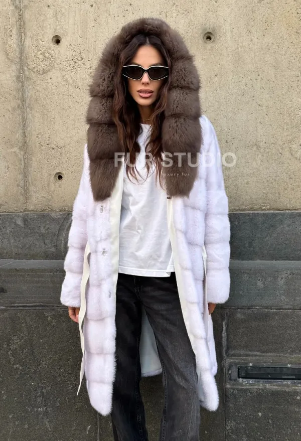 Модель выглядит дорого и нарядно. Беспроигрышный вариант для настоящих модниц, которые любят приковывать взгляды. Длина прекрасно подходит под любой гардероб. Купить белую норковую шубу с капюшоном из меха куницы может только женщина, которая умеет любить себя.