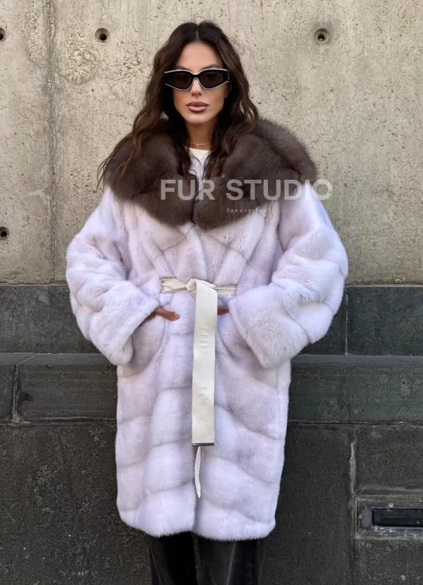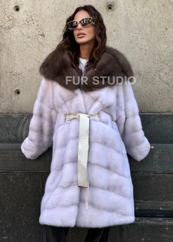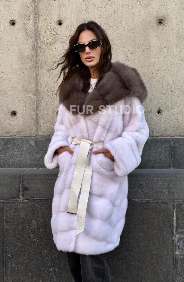 Шуба норковая с капюшоном из меха куницы, цвет жемчуг – стиль и классика прекрасных леди. Модель создает образ «Снежной королевы» - неприступной и уверенной в себе женщины, которая любит жизнь. Мех куницы согреет не только тело, но и душу. Теплый капюшон бережно защитит прическу от непогоды, а пояс подчеркнет изгибы талии.