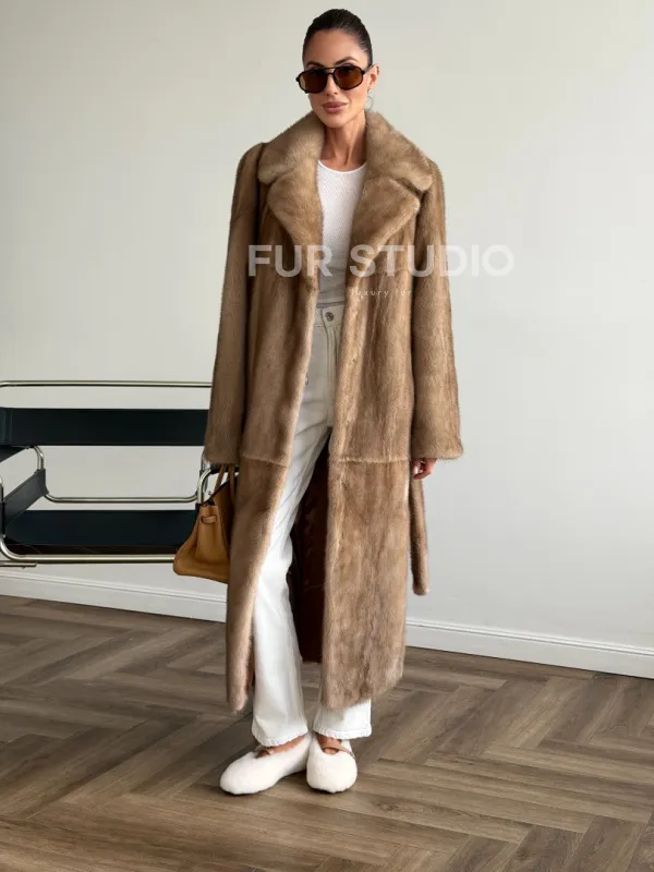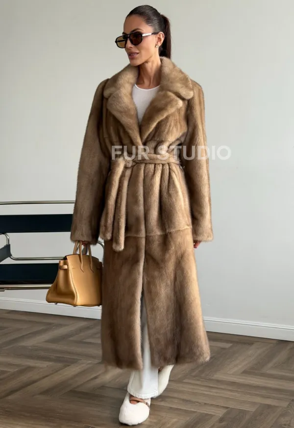 Мех данной шубы аукционная норка , цвет бежевый. Предлагается в размерах от 42 до 50. Длина модели 115-120 см, что выгодно подчеркивает фигуру девушек. Эта модель идеально подойдет для девушек и женщин, предпочитающих роскошные натуральные меха.