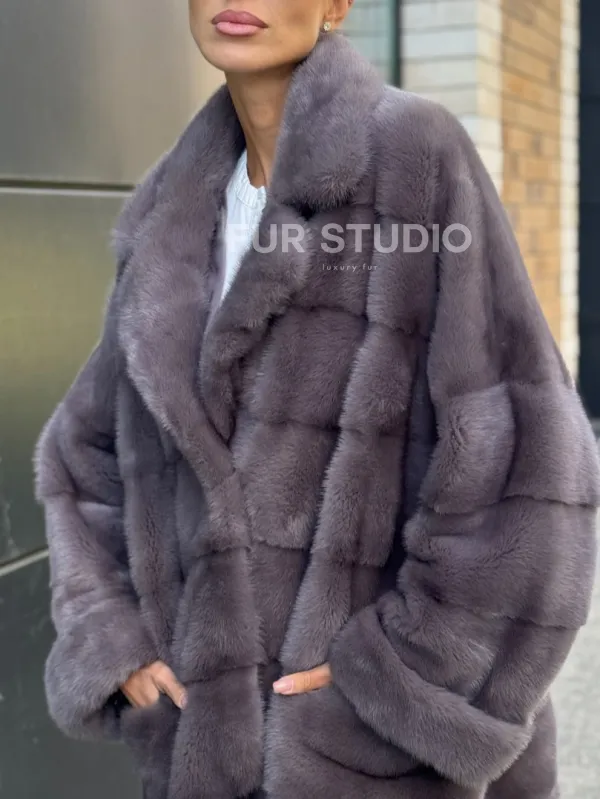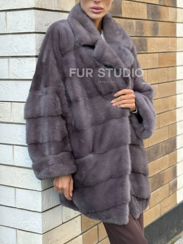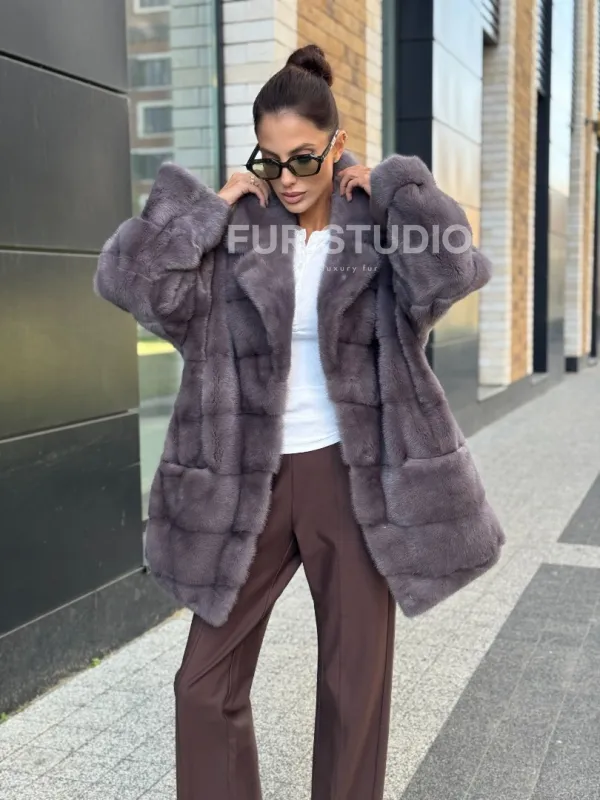 Длинные рукава подчеркнут нежные кисти, а удобные карманы не допустят, чтобы они замерзли. Модель подойдет под базовый гардероб, сочетается с вечерним нарядом. Неординарная сумочка дополнит образ, и вы будете выглядеть, как с обложки журнала. Купить короткую шубу из меха норки с воротником из меха куницы цвет лаванда могут только девушки, которые знают, что хотят от жизни.